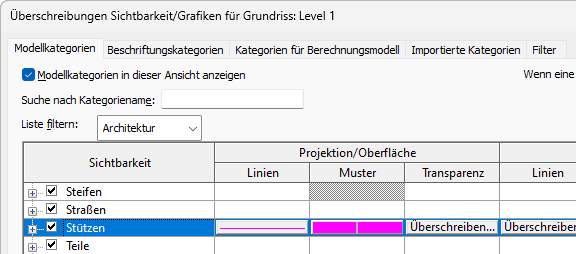 In der folgenden Abbildung sind in der Kategorie Stützen Überschreibungen für Projektion/Oberflächenlinien und Muster vorhanden.