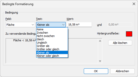 Beispiele für die Verwendung der bedingten Formatierung sind eine Bedingung, mit der angezeigt wird, dass der Flächeninhalt eines Bereichs einen gegebenen Mindestwert unterschreitet oder ob alle Räume im Modell mit der richtigen Menge Luft versorgt werden.