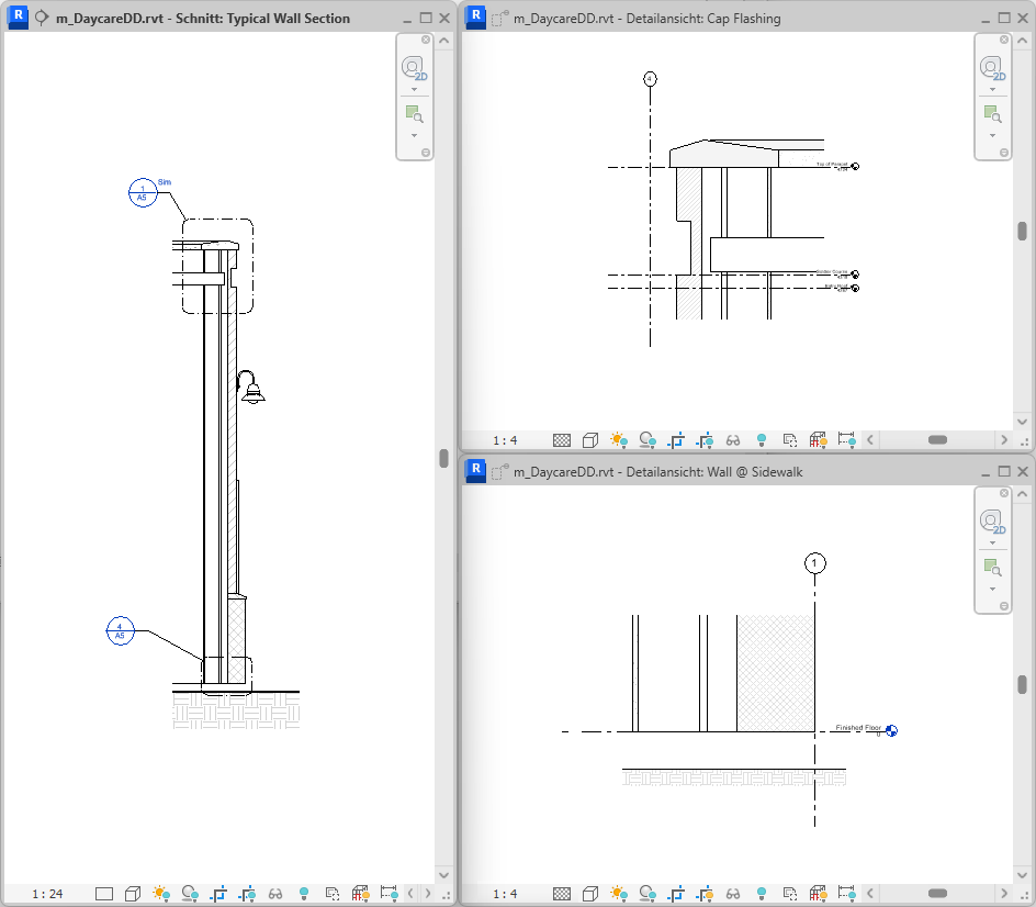 Sie können Detailausschnitte zu Draufsichten, Schnittansichten, Detailansichten oder Ansichten hinzufügen. In diesen Ansichten ist die Detailausschnittsbeschriftung mit der Detailausschnittsansicht verknüpft. Die Detailausschnittsansicht zeigt eine vergrößerte Version eines Teils der übergeordneten Ansicht und liefert zu diesem Teil des Gebäudemodells weitergehende Informationen.