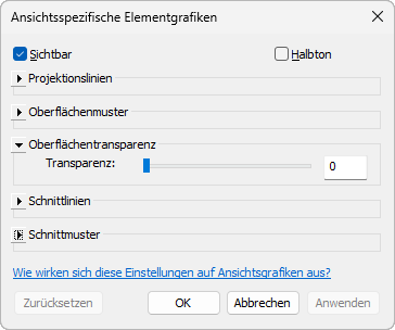 Das Dialogfeld Ansichtsspezifische Elementgrafiken wird zeigt die aktuellen Einstellungen für Sichtbarkeit und grafische Darstellung für das Element an. Erweitern Sie jeden Abschnitt, um seine Einstellungen zu sehen.