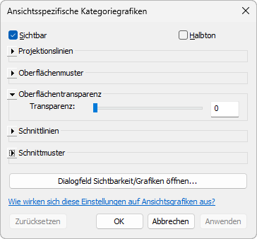 In jeder Ansicht können Sie Sichtbarkeit und grafische Darstellung für eine ausgewählte Kategorie von Elementen überschreiben.