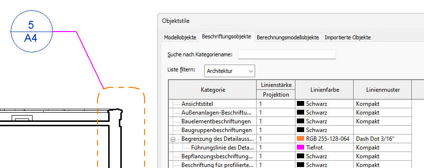Sie können Linienstärke, Farbe und das Muster von Detailausschnittsbeschriftungsblöcken und Führungslinien ändern. Die hier angegebenen Einstellungen gelten für alle Detailausschnitte des Projekts.