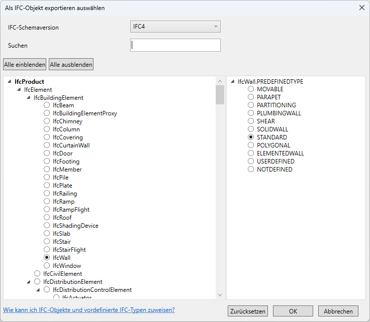Über ein Dialogfeld können Sie IFC-Objekte und vordefinierte Typen Familienexemplaren und -typen zuordnen. In diesem Dialogfeld können Sie das IFC-Schema auswählen und dann nach bestimmten IFC-Objekten suchen. Wählen Sie die Objekte und Typen im Dialogfeld aus. Sie werden auf die Parameter für Elemente in Ihrem Modell angewendet. Das gleiche Dialogfeld wird verwendet, um die Objekte in Ihren IFC-Exporten zu steuern. Weitere Informationen erhalten Sie unter Angeben von IFC-Elementen für Familien.