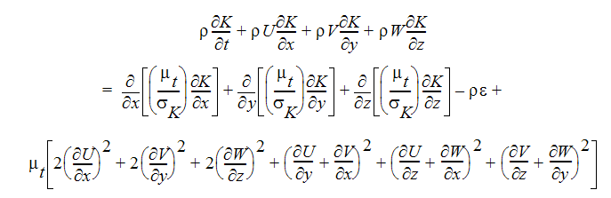 Die beiden oben beschriebenen Turbulenzmodelle sind für Strömungen mit hoher Reynoldszahl oder für Strömungen geeignet, bei denen das dominierende Strömungsregime vollständig turbulent ist. In folgenden Fällen kann es aber bei den oben angegebenen Modellen zu Ungenauigkeiten kommen: Strömungen, bei denen große Bereiche der Problemdomäne laminar sind, oder Strömungen, die als turbulente Strömung beginnen, aber in einem laminaren Strömungsregime enden (oder umgekehrt). Dies umfasst nicht die laminaren Bereiche in den Begrenzungs-Layern, tritt aber häufiger auf in Problemen mit großen, stagnierenden offenen Räumen oder Problemen mit zahlreichen Hindernissen, die möglicherweise die Strömung blockieren und die lokalen Strömungsgeschwindigkeiten verringern. In diesen Fällen ist ein Turbulenzmodell mit einer niedrigen Reynoldszahl besser geeignet. Das in Autodesk® CFD verwendete Modell ist wieder ein Modell mit zwei Gleichungen, das in die turbulente kinetische Energie, K, und die turbulente Energiedissipation aufgelöst wird. Für K wird folgende Gleichung verwendet: