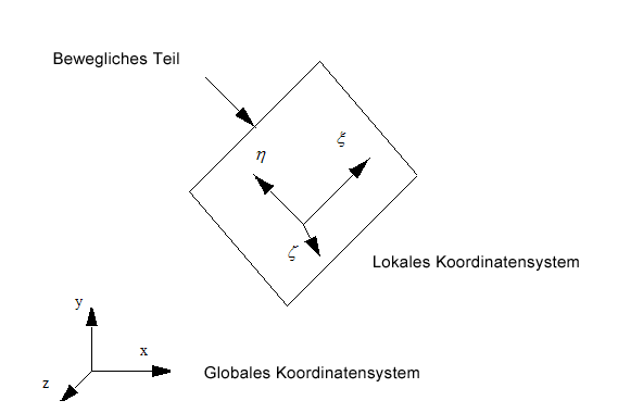 Um beliebige Bewegungen zu ermöglichen, wird in jedem bewegten Teil ein lokales Koordinatensystem platziert. Es wird davon ausgegangen, dass sich das Teil in Bezug auf dieses lokale Koordinatensystem nicht bewegt. Anstelle dessen bewegt sich das lokale Koordinatensystem im Vergleich zum globalen Koordinatensystem.