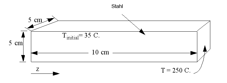 Aus den Eigenschaften der obigen Tabelle und unter Verwendung von 35 C als Anfangstemperatur und 250 C als Randtemperatur wird die Temperatur 2.5 cm vom Rand bei t = 30 Sekunden berechnet: