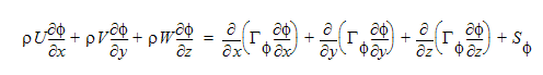Mit Ausnahme der Kontinuitätsgleichung beschreiben die zugrunde liegenden Gleichungen den Transport einer Größe (z. B. U, V, T) durch die Lösungsdomäne. Die zugrunde liegenden Gleichungen haben folgende Form: