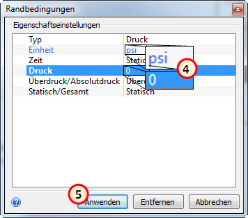 In der Designstudienleiste muss die Bedingung Druck aufgelistet sein und den Wert 0 psi haben.