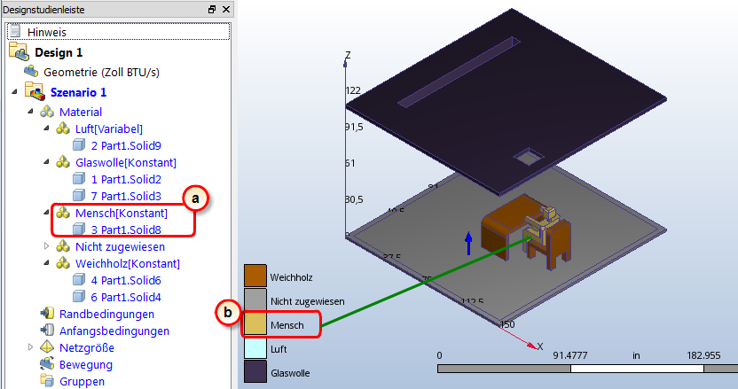 a. Überprüfen Sie in der Designstudienleiste, ob die Materialzuweisung für Mensch korrekt ist.