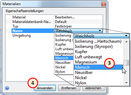 3. Stellen Sie sicher, dass im Schnellbearbeitungs-Dialogfeld Materialien der Typ auf Festkörper gesetzt ist und als Name Mensch angegeben ist.