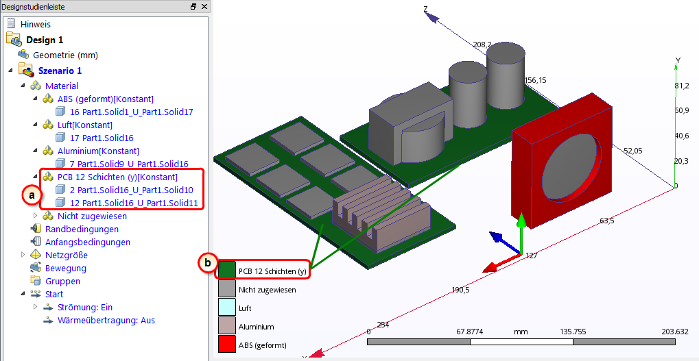 6. In der Designstudienleiste können Sie anhand der Teilfarbe überprüfen, ob das Leiterplattenmaterial korrekt zugewiesen wurde: