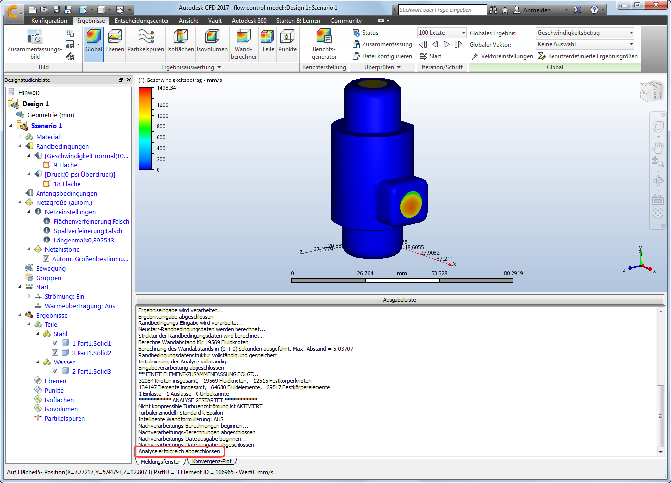 Die Ausgabeleiste zeigt nach Abschluss der Simulation Analyse erfolgreich abgeschlossen an:
