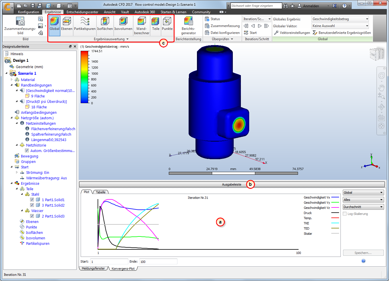 a. Der Konvergenz-Plot zeigt die die Berechnungsbedingung während der Simulation. Wenn die Linien flach auslaufen, ändert sich die Lösung nicht mehr und die Simulation ist abgeschlossen.