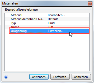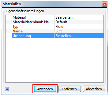 Stellen Sie sicher, dass im Schnellbearbeitungs-Dialogfeld der Typ auf Fluid gesetzt und als Name Luft angegeben ist.
