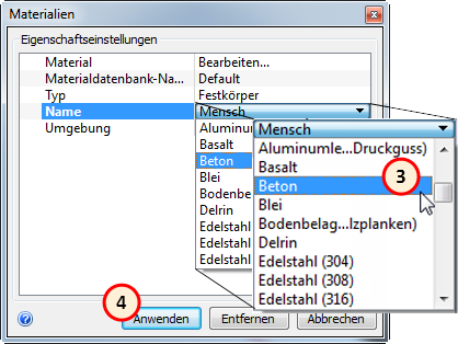 Stellen Sie sicher, dass im Schnellbearbeitungs-Dialogfeld Materialien der Typ auf Festkörper gesetzt ist und als Name Beton angegeben ist.