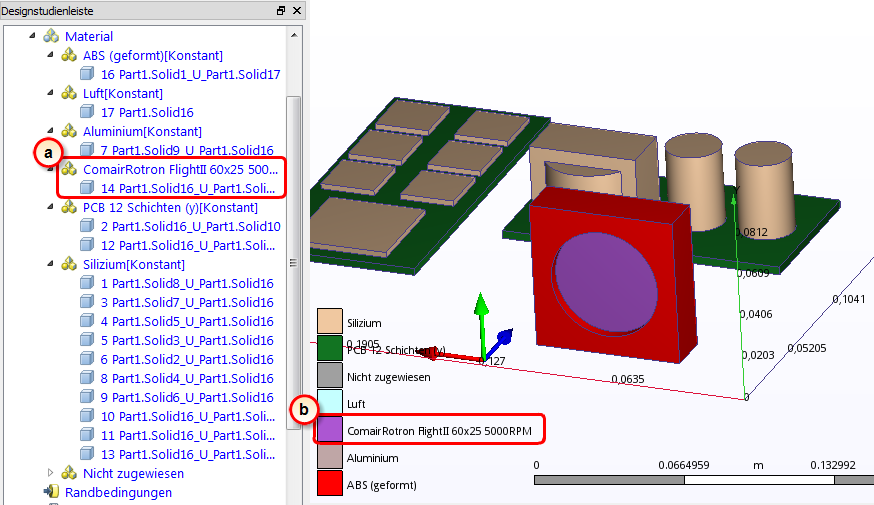 7. In der Designstudienleiste können Sie anhand der Teilfarbe überprüfen, ob das Gebläsematerial korrekt zugewiesen wurde: