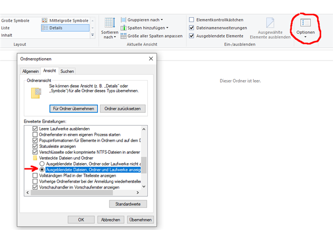 Aktivieren Sie im Windows-Explorer unter Optionen die Option Ausgeblendete Dateien, Ordner und Laufwerke anzeigen, um den Ordner zu suchen.