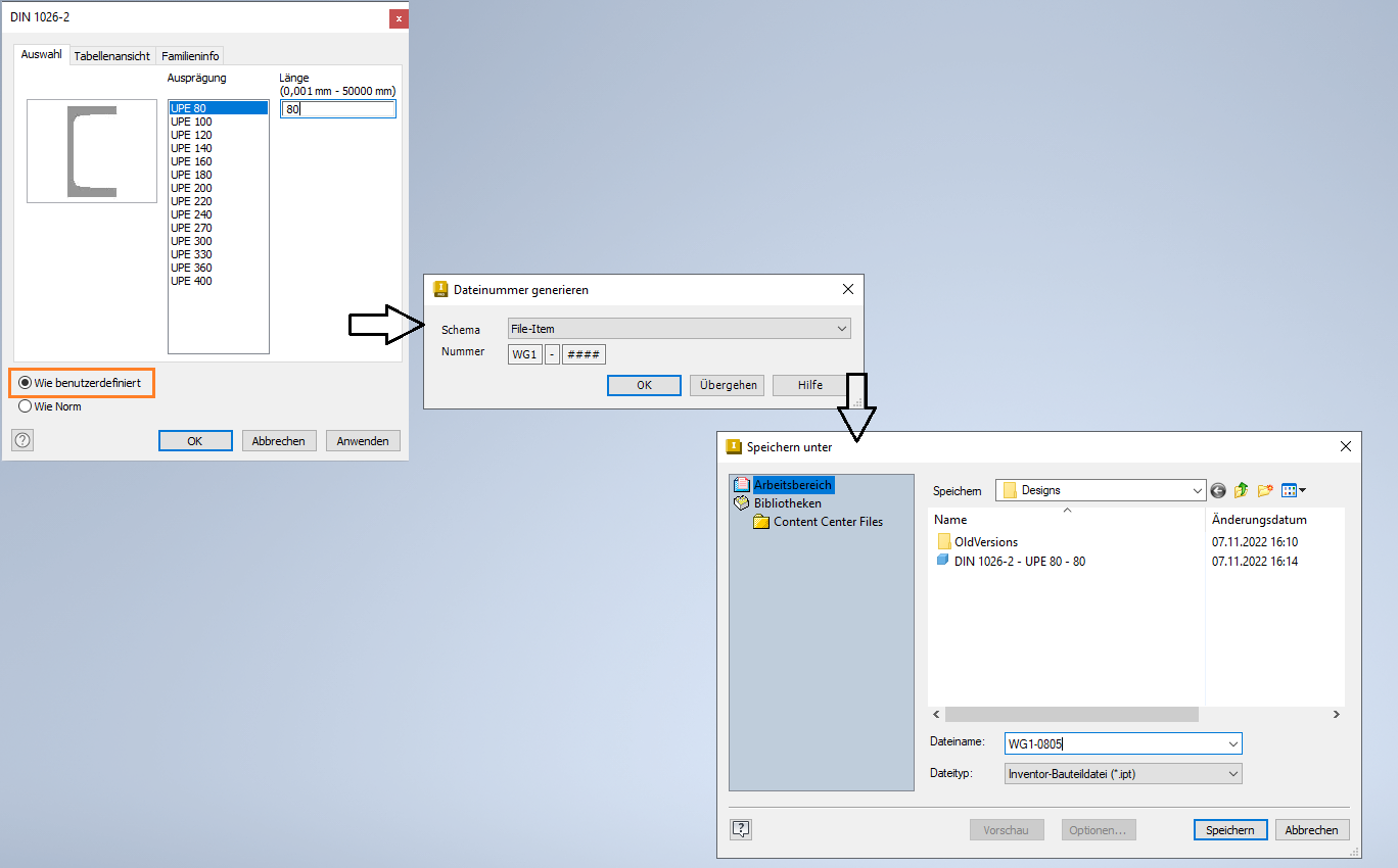 Wenn Sie ein Inhaltscenter-Bauteil als benutzerdefiniertes Bauteil hinzufügen, werden die Vault-Dateinummerierung und die VDS-Speicherung vorgabemäßig unterdrückt. Sie können die benutzerdefinierte Inhaltscenter-Komponente im Projektpfad speichern. Es findet keine Dateinummerierung und keine VDS-Interaktion statt.