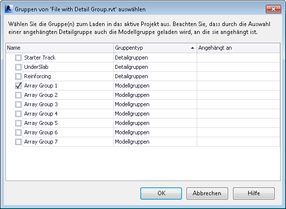 Wählen Sie eine oder mehrere Gruppen zum Laden aus, und klicken Sie dann auf OK, um eine Instanz der ausgewählten Gruppen in das aktuelle Revit-Projekt zu laden.