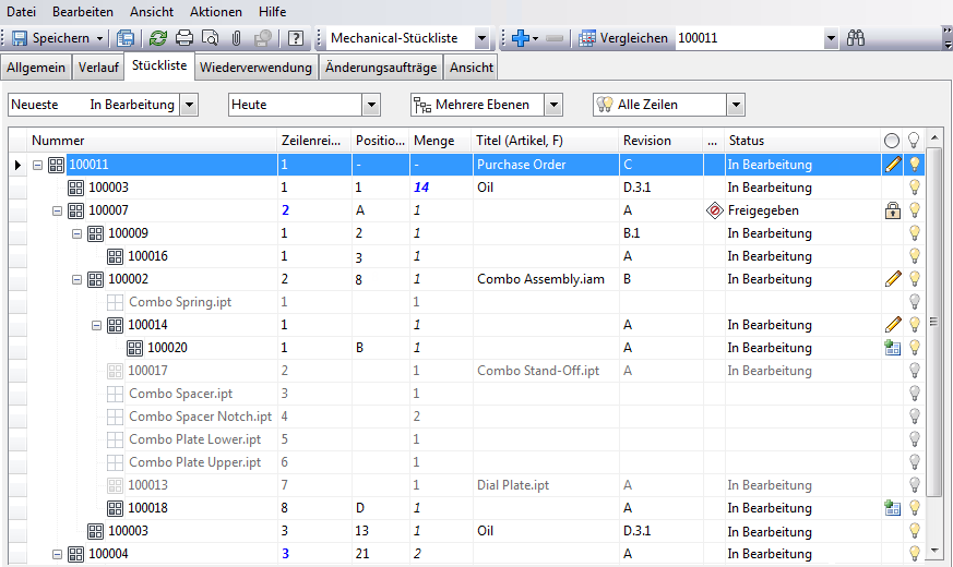Zur besseren Verwaltung Ihrer Stücklisten sollten Sie die Symbole und Statuseinstellungen der Registerkarte Stückliste kennen.