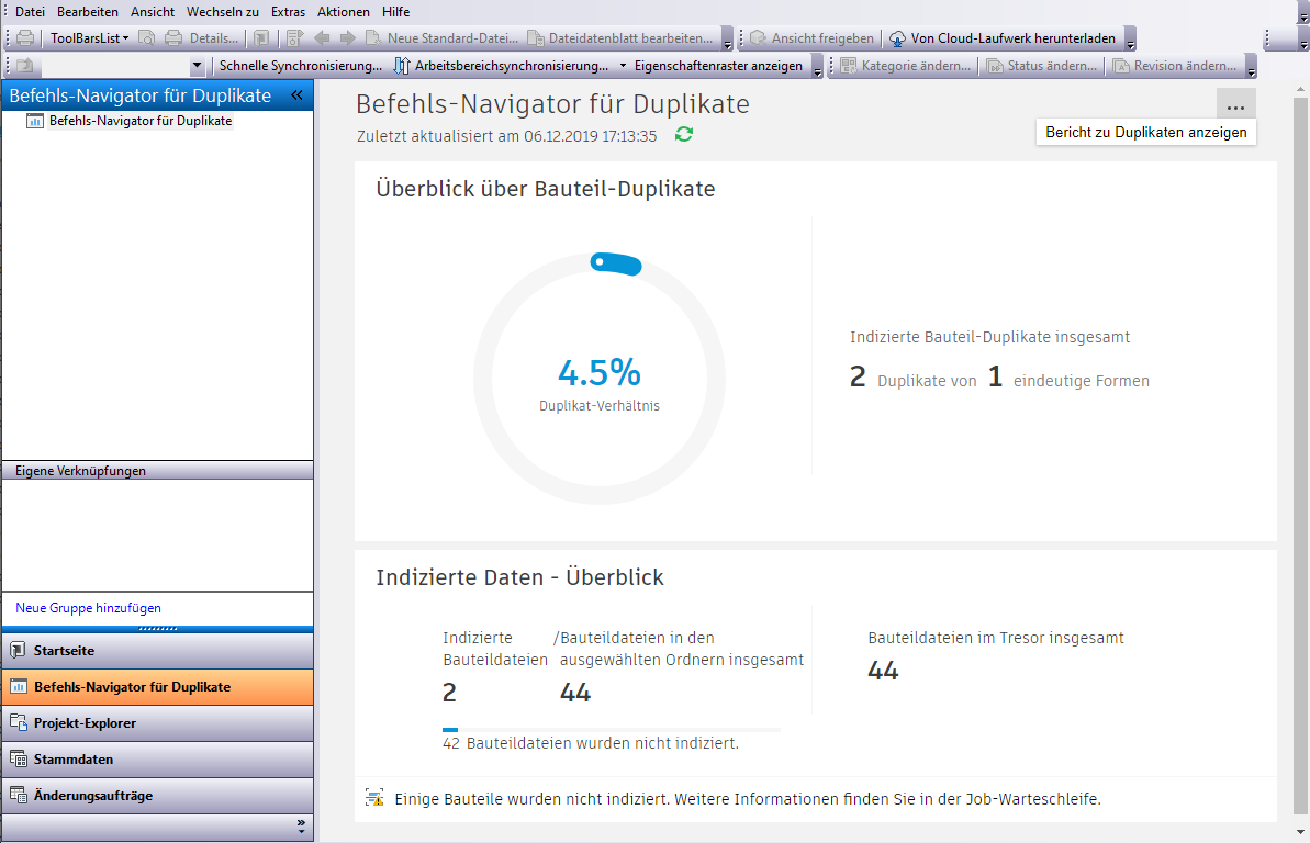 Verwenden Sie den Befehls-Navigator, um den Status von doppelten und indizierten Bauteilen anzuzeigen.