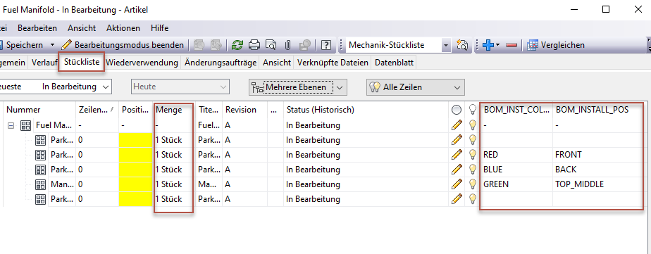 Exemplareigenschaften funktionieren auf die gleiche Weise wie Artikeleigenschaftsexemplare in der Vault-Stückliste. Elemente mit derselben Bauteilnummer werden nach dem Exemplareigenschaftswert gruppiert.