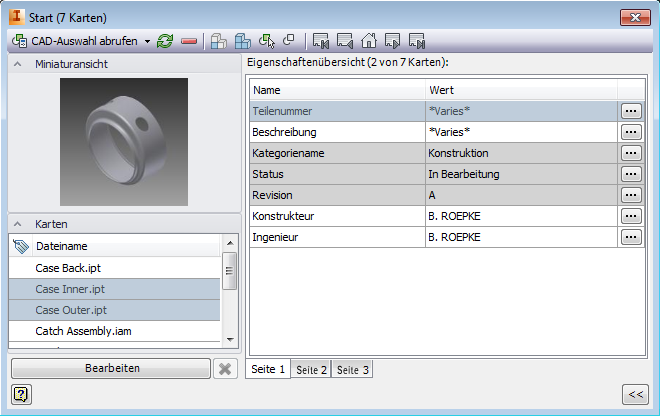 Wenn ein Bauteil im CAD-Ansichtsbereich, im Modell oder in der Vault-Browserliste ausgewählt wird, wird das Bauteil im Ansichtsbereich bzw. in der Liste hervorgehoben, und die Datenkarte wird automatisch aktualisiert, um die relevanten Informationen für dieses Bauteil anzuzeigen.