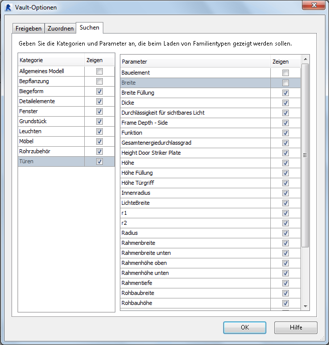 Sie können steuern, welche Kategorien und Parameter in Suchvorgängen im linken Bereich des Dialogfelds Familie laden angezeigt werden, indem Sie die Einstellungen auf der Registerkarte Suche im Dialogfeld Tresoroptionen konfigurieren.