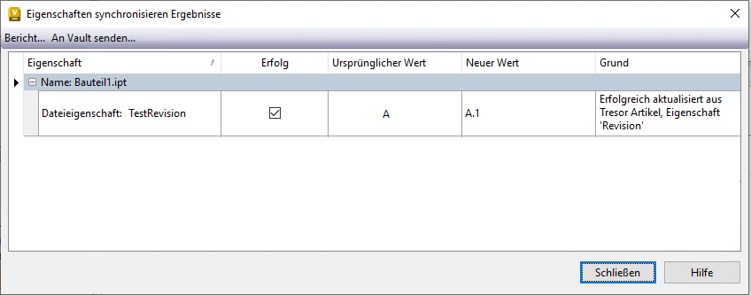Die Inventor-Eigenschaft (benutzerdefinierte Eigenschaft) wird immer mit dem Artikel Part1 synchronisiert (der über den primären Modellzustand zugewiesen wird). TestRevision wird daher nach der Synchronisierung zu Revision A.1 überarbeitet. Die Dateirevision bleibt jedoch Revision A.