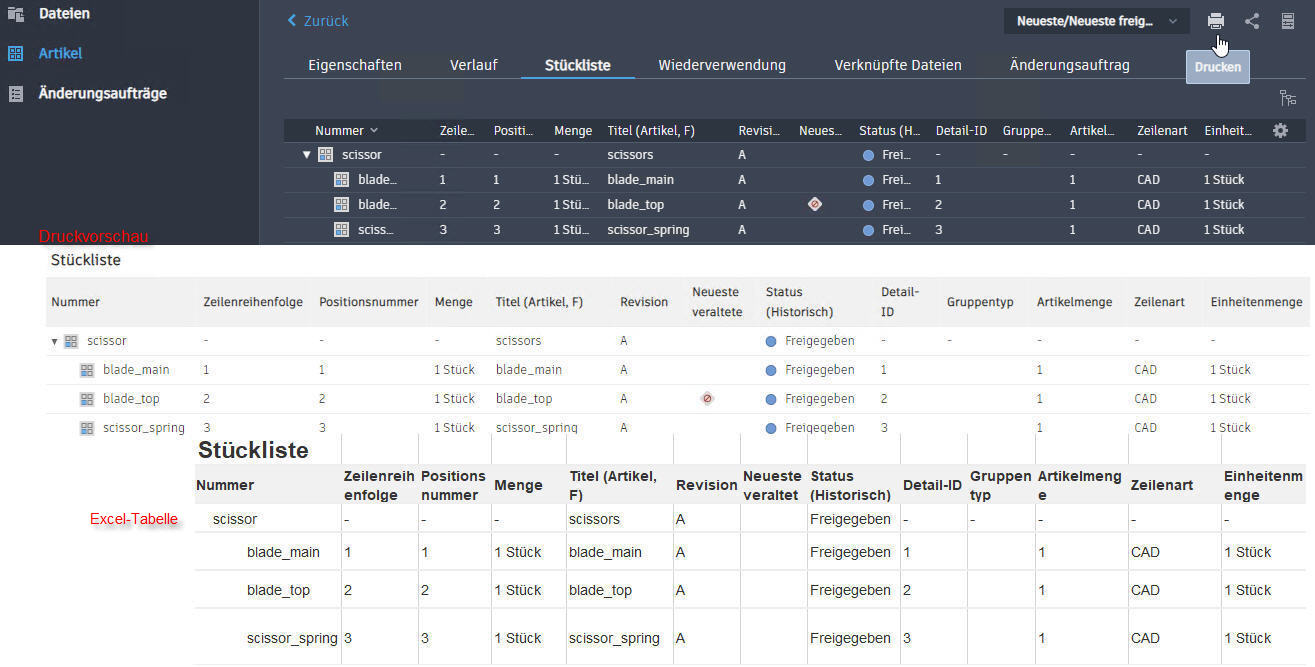 Klicken Sie auf den Detailregisterkarten für Dateien, Artikel oder Änderungsaufträge auf das Symbol Drucken.