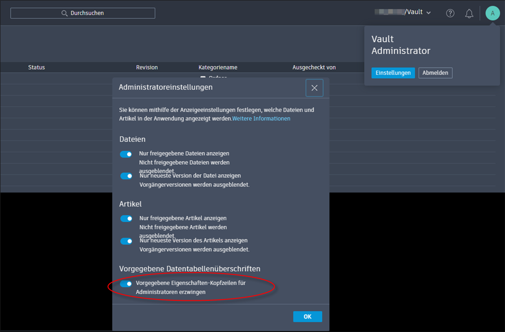 Wenn Sie Administrator sind, können Sie die erforderlichen Spalten konfigurieren und dies für alle Benutzer erzwingen. Sobald dies erzwungen wurde, können Benutzer ohne Administratorrechte die Vorgabespalten im Arbeitsbereich Dateien, Artikel, Änderungsaufträge und Suchen nicht mehr ändern. Derzeit werden vom Administrator definierte Kopfzeilen im Arbeitsbereich Suchen nicht erzwungen.