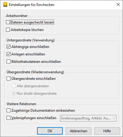 Wenn Sie das Dialogfeld Einchecken unterdrücken, können Sie angeben, welche Auswirkungen der entsprechende Tresorvorgang auf die zugehörigen Dateien hat.