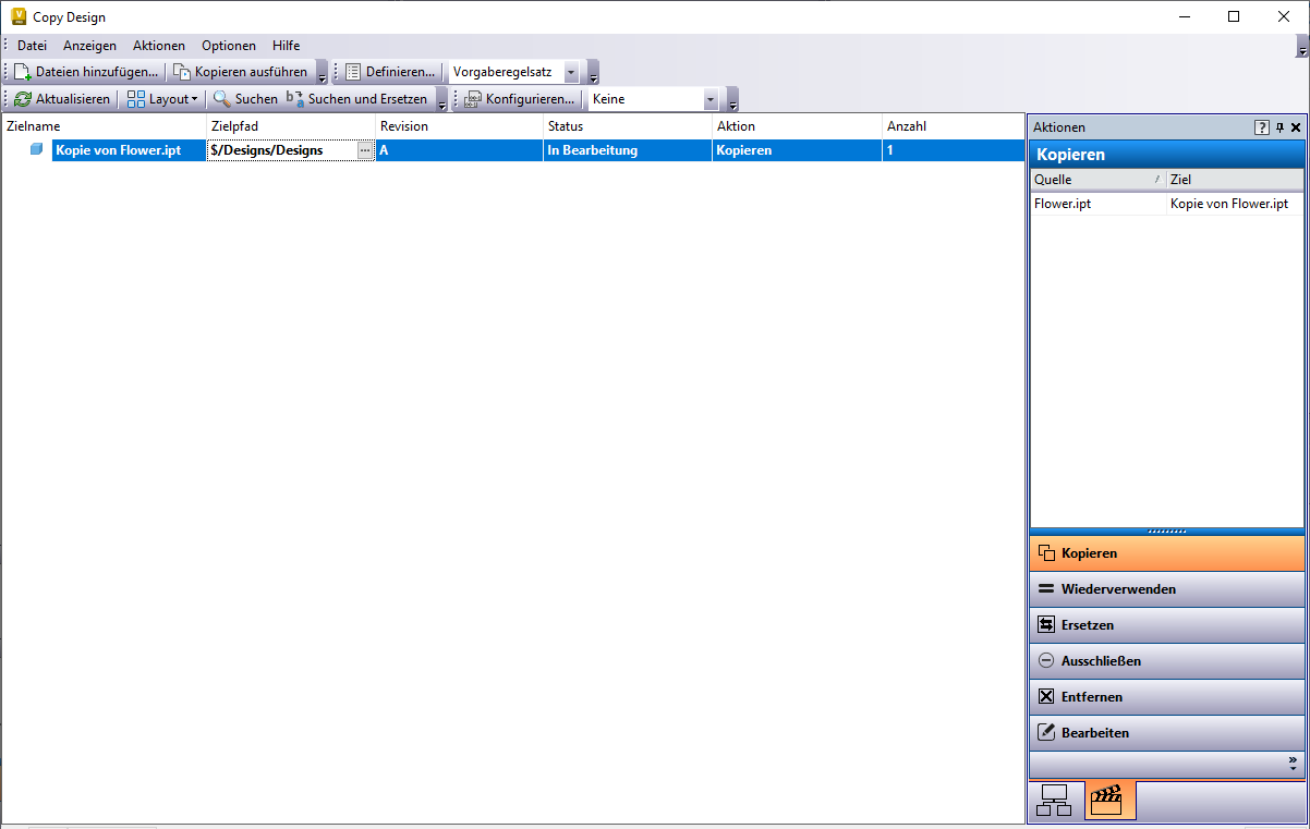 Konstruktion kopieren ist nun ein modusunabhängiges Dialogfeld mit einem Werkzeugkasten. Es kann geöffnet bleiben, während Sie den Vault-Client für andere Befehle verwenden oder zu kopierende Dateien hinzufügen.