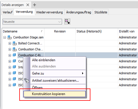 Klicken Sie im Dialogfeld Konstruktion kopieren mit der rechten Maustaste auf die Datei, und wählen Sie den Befehl Kopieren in, um die ausgewählten Dateien aus dem Hauptraster an einen angegebenen Speicherort zu kopieren. Halten Sie die STRG-Taste gedrückt, um mehrere Dateien gleichzeitig auszuwählen.