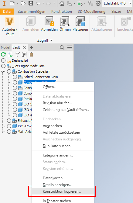 Klicken Sie in Inventor mit der rechten Maustaste auf eine Datei im Vault Browser, und klicken Sie auf Copy Design.