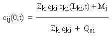 Die Summierungen werden über alle Verbindungen k,i vorgenommen, bei denen Volumenstrom in den Energiehöhenknoten (i) der Verbindung i,j fließt, wobei Lki die Länge der Verbindung k ist, Mi die Substanzmasse, die von einer externen Quelle am Knoten i eingebracht wird, und Qsi die Quell-Volumenstromrate ist. Die Begrenzungsbedingung für Verbindung i,j hängt von den Endknoten-Konzentrationen aller Verbindungen k,i ab, die Volumenstrom in Verbindung i,j einbringen. Daher bilden die Gleichungen (1) und (2) einen gekoppelten Satz von Differentialgleichungen/algebraischen Gleichungen über alle Verbindungen im Netz.
