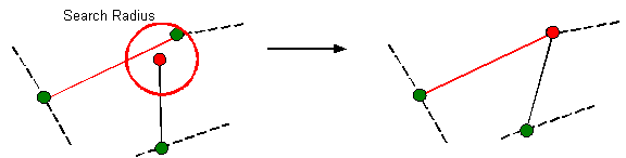 Wenn sich ein Knoten innerhalb des Suchradius des Knotens befindet, der mit einer Verbindung verknüpft ist, und die Höhentoleranz eingehalten wird, werden die Knoten zu einem Knotenpunkt zusammengeführt (Beispiel 2).