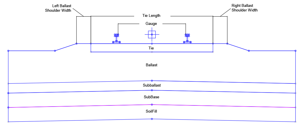 In layout mode the subassembly displays the links comprising the rails, tie, ballast, subballast and side slopes.