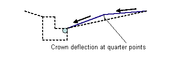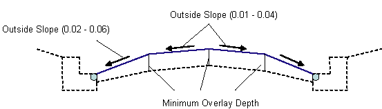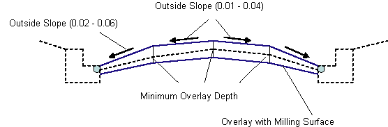 If overlay links are too steep, or if the Maximum Breakover is exceeded at the centerline, or the Min Crown Deflection is not obtained, some or all links are flattened to their maximum slopes. Milling surfaces are inserted to hold the minimum overlay depths at the quarter points and centerline.