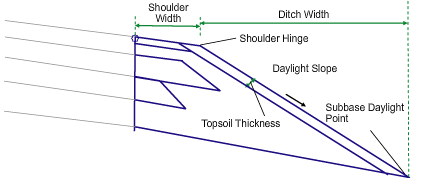 The shoulder daylight link can be inserted with either a fixed slope (Hold Daylight Slope = True), or a fixed width (Hold Daylight Slope = False). If a fixed slope is used, the daylight link is extended from the outside edge of the shoulder until it intersects the subbase link. Otherwise, the subbase layer is extended for the Daylight Width beyond the outside edge of the shoulder, and the daylight link is connected to the end of the subbase.