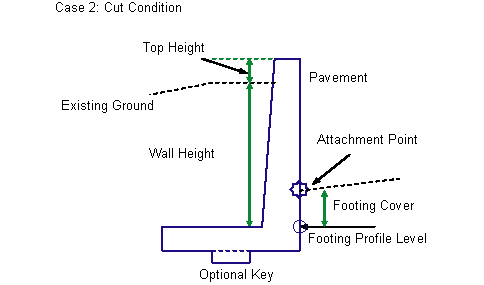 This subassembly can be inserted on either left or right sides. The attachment point is different for the fill or cut condition. In fill, the attachment point is assumed to be where the finish surface intersects the inside face of the wall, below the top of the wall, at a distance equal to the Top Height parameter. In cut, the attachment point is assumed to be where the finish surface intersects the inside face, above the top-of-footing, at a distance equal to the Footing Cover parameter. The wall height is determined from the Wall Height or Profile input. In fill, the sloping wall face is toward the center of the carriageway. In cut, the sloping wall face is away from the carriageway, towards the earth being retained. If the Key option is set to No, then the base of the footing is a single horizontal link. If the Key option is used, links to define the optional key are inserted.