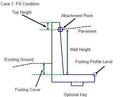 Wall height is determined from top of the footing to attachment point of ground level on the vertical face, whichever is higher. Wall battered slope, width of the footing, optional key dimensions, and the location of the key center, are all functions of the wall height.