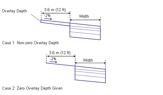 In layout mode, this subassembly may be attached to any convenient point. The overlay layer is shown at a uniform depth, with a width of 3.6 meters or 12 feet and extended at a slope of -2%. If the Overlay Depth is zero, the overlay is shown as a single link. The widening lane extends from the edge-of-overlay at a slope of -2%.