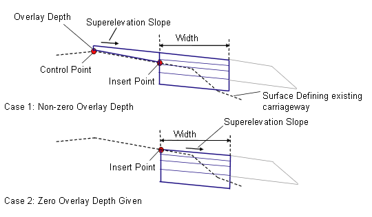 If the Overlay Depth is zero, the widening lane extends outward from the Insert Point Offset on the Existing Surface at the superelevation slope for the given Width.