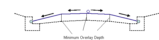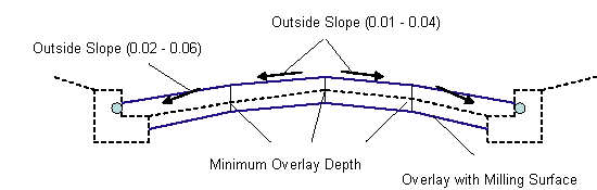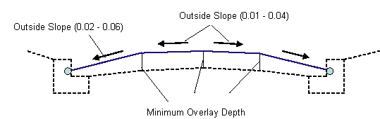 If the overlay links are too steep, or if the Maximum Breakover is exceeded at the centerline, or the Min Crown Deflection is not obtained, some or all links are flattened to their maximum slopes. Milling surfaces are inserted to hold the minimum overlay depths at the quarter points and centerline.