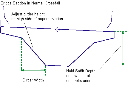 The subassembly builds the links for the bridge deck and under-structure based on the input parameter values given. In superelevation, not all of the structure is rotated. The Soffit Depth is held to the given value from the top-edge-of-deck on the low side of the bridge, and the height of the girder is adjusted on the high side to the root of the deck.