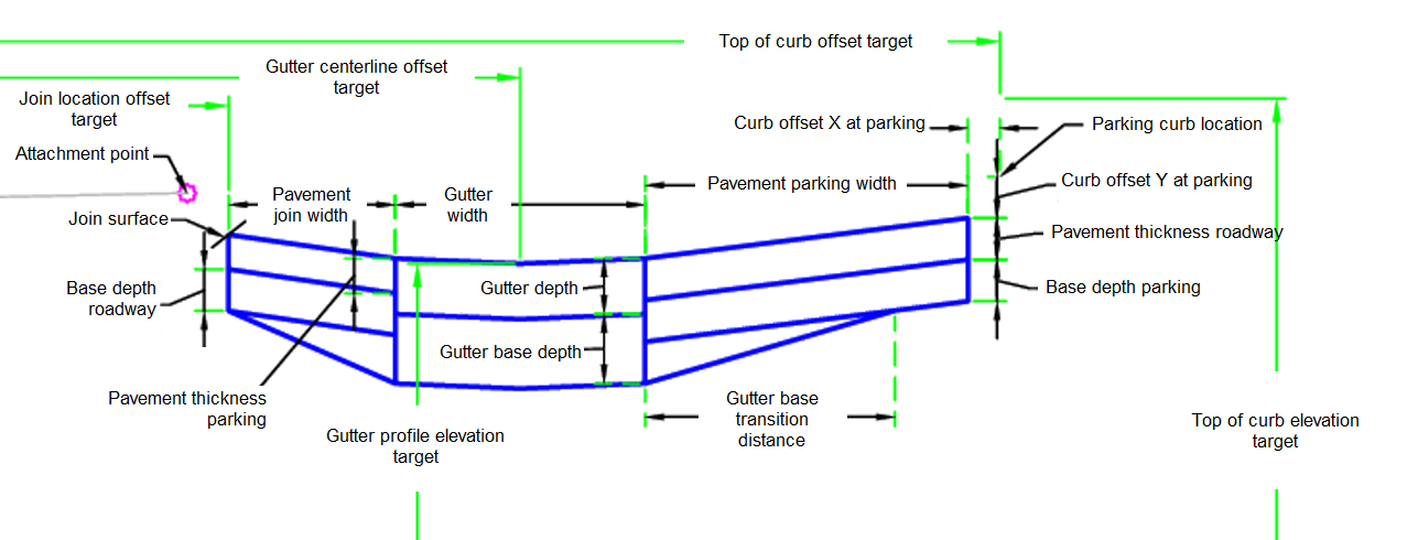 | Top of Kerb Offset | Used to determine the top of kerb level of the tie-in location of parking kerb. The following object types can be used as targets for specifying the level: profiles, 3D polylines, feature lines, or survey figures. | Required |