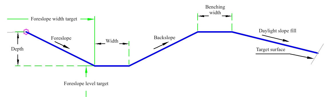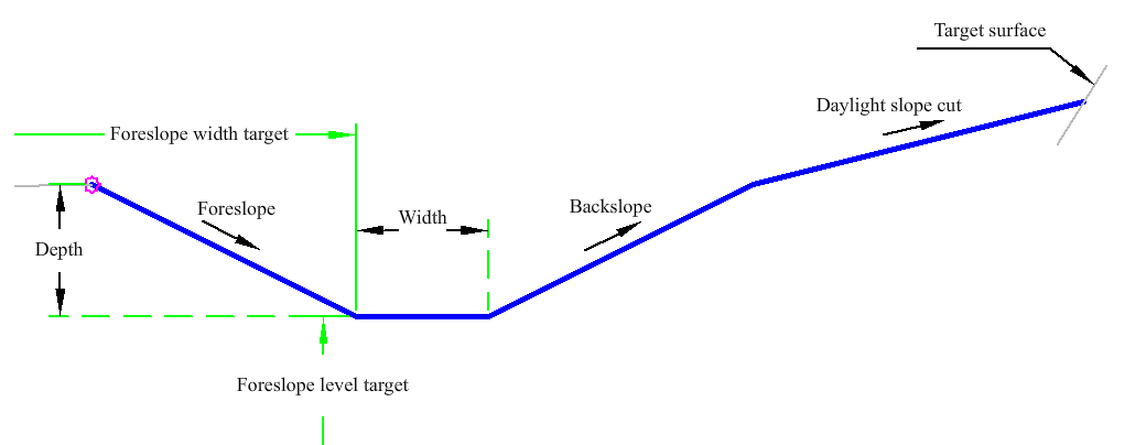 | Foreslope Width | May be used to override the foreslope width. The following object types can be used as targets for specifying this: alignments, polylines, feature lines, or survey figures. | Optional |