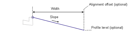 The link is added in the direction of insertion starting at the attachment point and going the given width and slope. If an offset horizontal alignment name is assigned to the Width during corridor modeling, the width of the lane will vary to match the offset of the alignment. If a profile name is assigned to the Slope, the slope is adjusted to match the profile level at the end of the link.