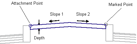 The central reserve crown point is calculated by intersecting lines extended between the attachment point and the marked point at the given slopes. If no junction is found, the central reserve is not inserted. If a non-zero Depth is given, the bottom of the central reserve links are inserted parallel to the top, and vertical links are added to close the shape.